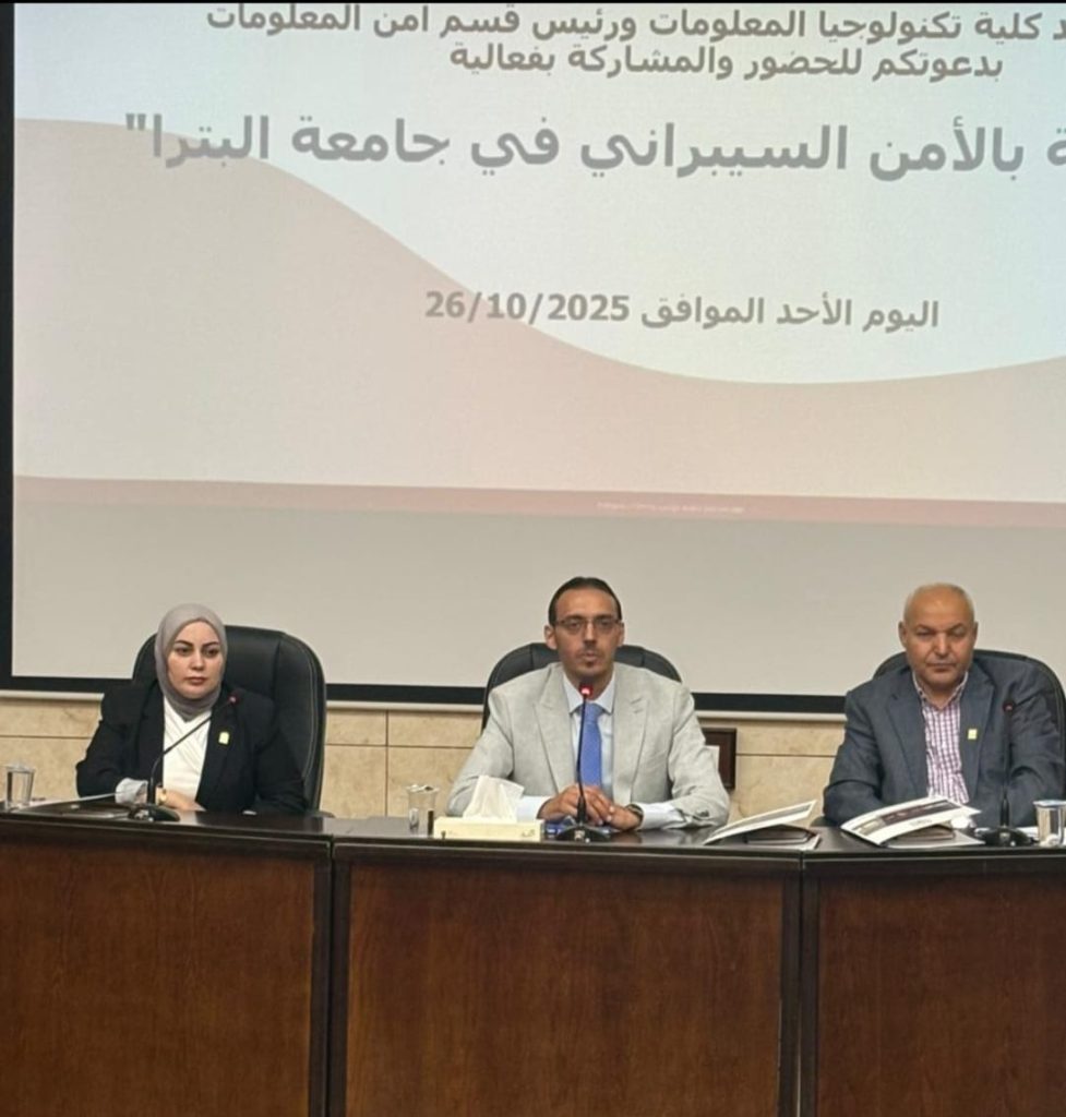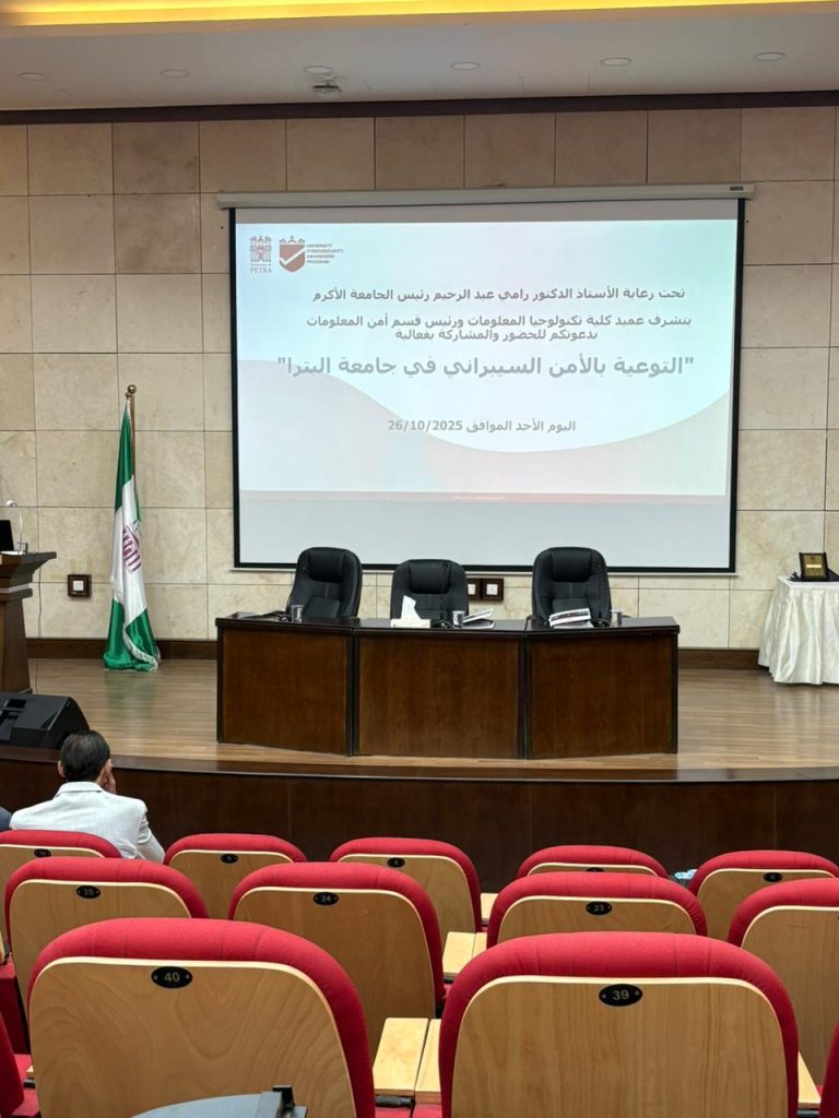 نظّمت كليّة تكنولوجيا المعلومات في جامعة البترا اليوم الأحد، فعاليّة توعويّة بعنوان “الأمن السيبراني في جامعة البترا”، بمناسبة شهر أكتوبر الذي يُعدّ شهر التوعية بالأمن السيبراني، وذلك في مسرح مركز الدراسات الدوائيّة في الجامعة، برعاية رئيس الجامعة الأستاذ الدكتور رامي عبد الرحيم.