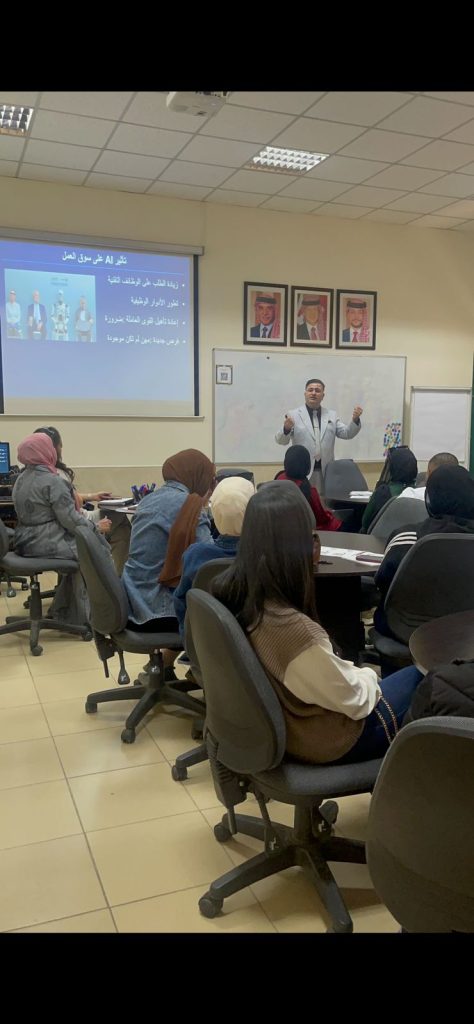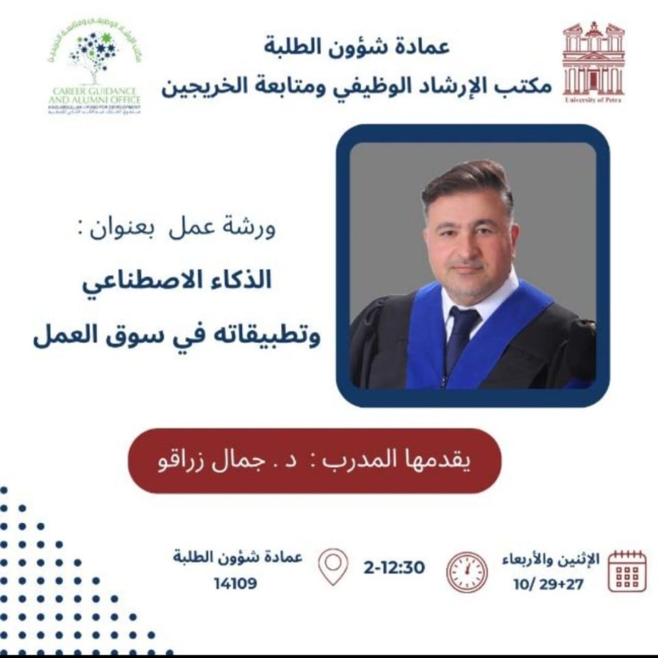 نظّم مكتب الإرشاد الوظيفي ومتابعة الخريجين في عمادة شؤون الطلبة بجامعة البترا اليوم الإثنين ورشة عمل بعنوان “الذكاء الاصطناعي وتطبيقاته في سوق العمل”، قدّمها الدكتور جمال زراقو، وذلك في مبنى العمادة، بحضور ستةٍ وعشرين طالبًا وطالبة.