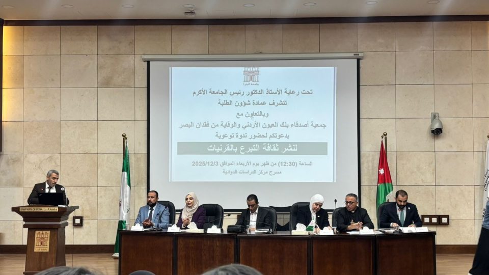نظّمت جامعة البترا ندوة توعويّة حول التبرّع بالقرنيات، ضمن حملات جمعية أصدقاء بنك العيون والوقاية من فقدان البصر، بهدف نشر الوعي بأهميّة التبرّع بعد الوفاة ودوره في إعادة البصر وتعزيز قيم التكافل الإنساني.