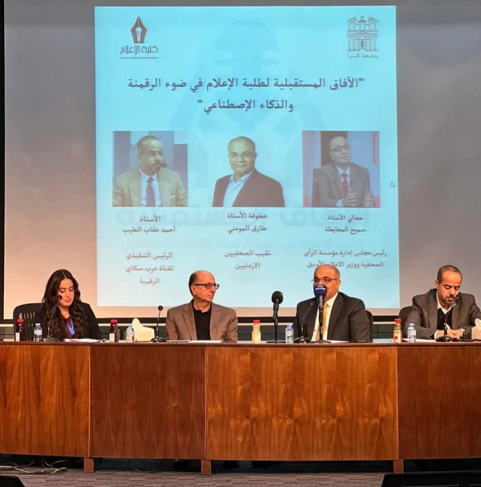 عقدت كليّة الإعلام، صباح أمس الإثنين، ندوةً بعنوان “الآفاق المستقبليّة لطلبة الإعلام في ضوء الرقمنة والذكاء الاصطناعي” على مسرح الأنباط في كليّة الإعلام، وذلك استكمالًا لمتطلبات مشروع التخرُّج للطالبة سدين القاضي وزميلها براء الرمحي، وتحت إشراف الدكتورة سارة العكور.