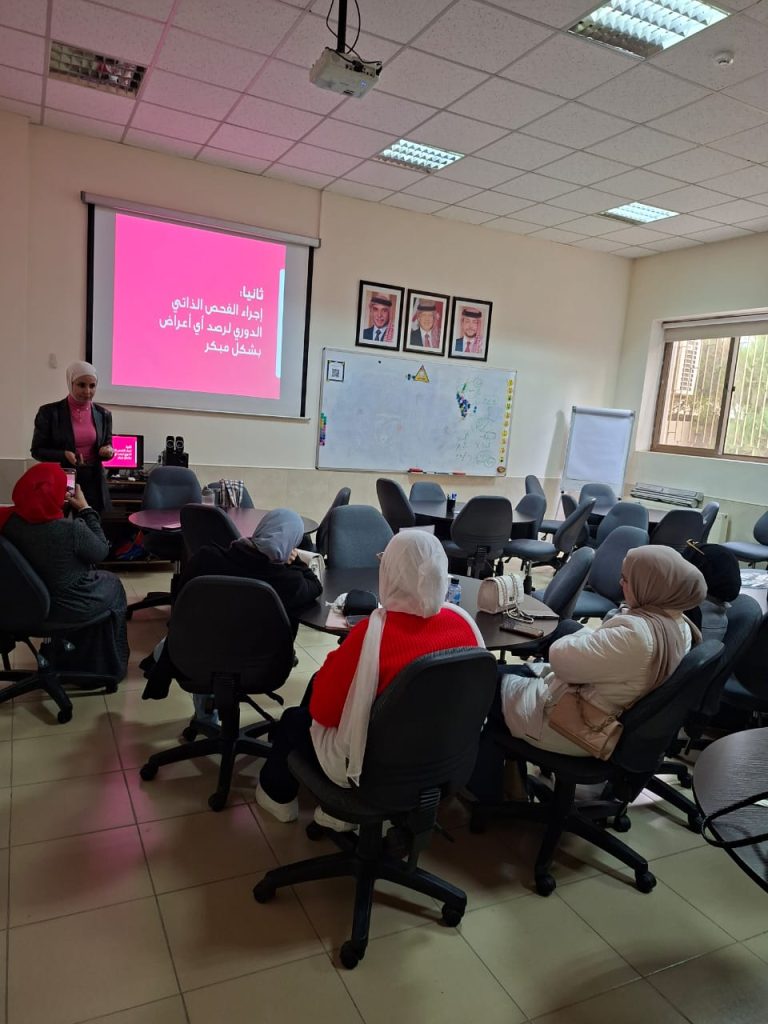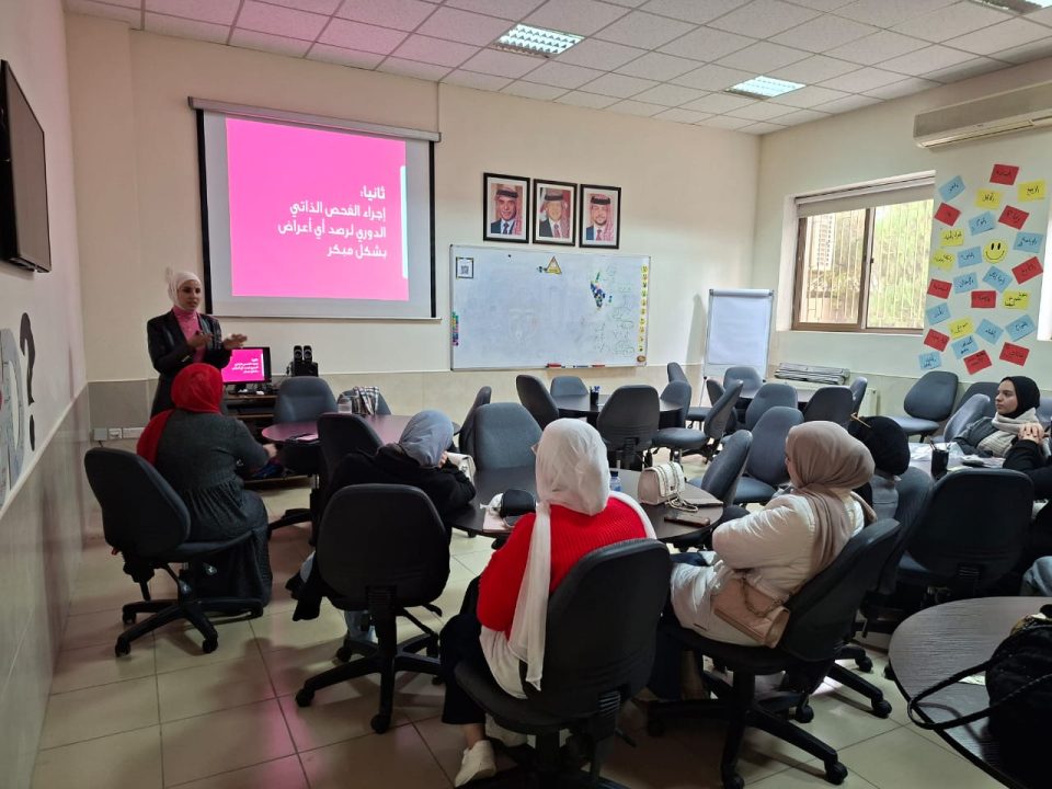 نظّّم مكتب الإرشاد الوظيفي ومتابعة الخرّيجين التابع لعمادة شؤون الطلبة في جامعة البترا، وبالتعاون مع البرنامج الأردني للسرطان، اليوم الأحد، ورشة توعوية بعنوان “أنتِ الأساس – للكشف المبكر عن سرطان الثدي”، قدّمتها الأستاذة رشا صوالحة.