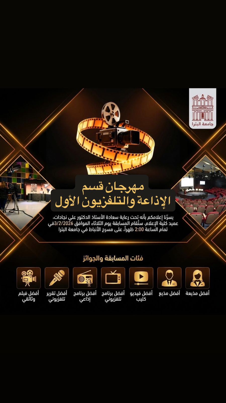يُنظّم قسم الإذاعة والتلفزيون في كليّة الإعلام بجامعة البترا، وبرعاية عميد الكليّة الأستاذ الدكتور علي نجادات “مهرجان قسم الإذاعة والتلفزيون الأوّل”، يوم الثلاثاء ٣/٢/٢٠٢٦، في تمام الساعة الثانية ظهرًا، على مسرح الأنباط في مبنى الكُليّة.